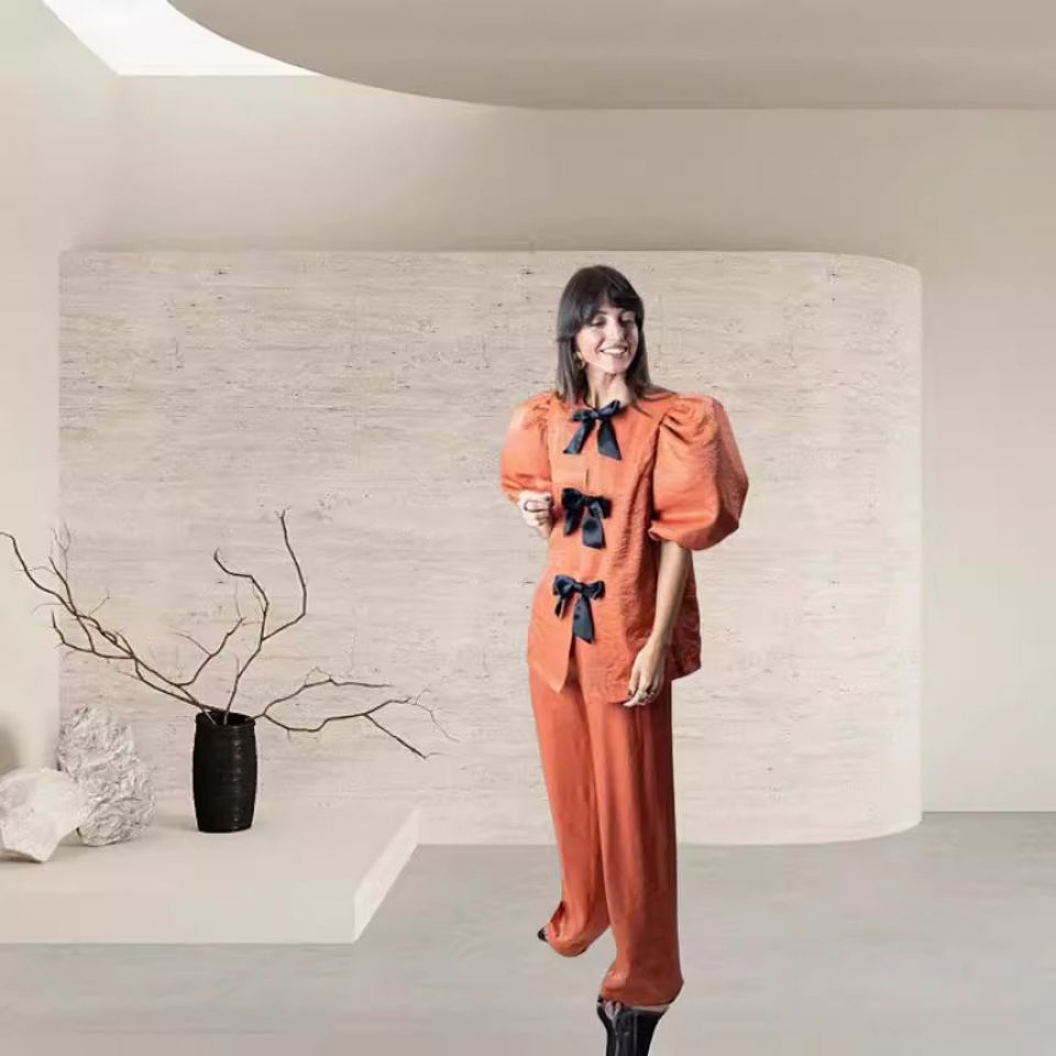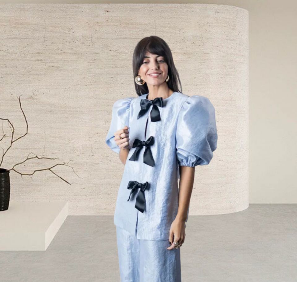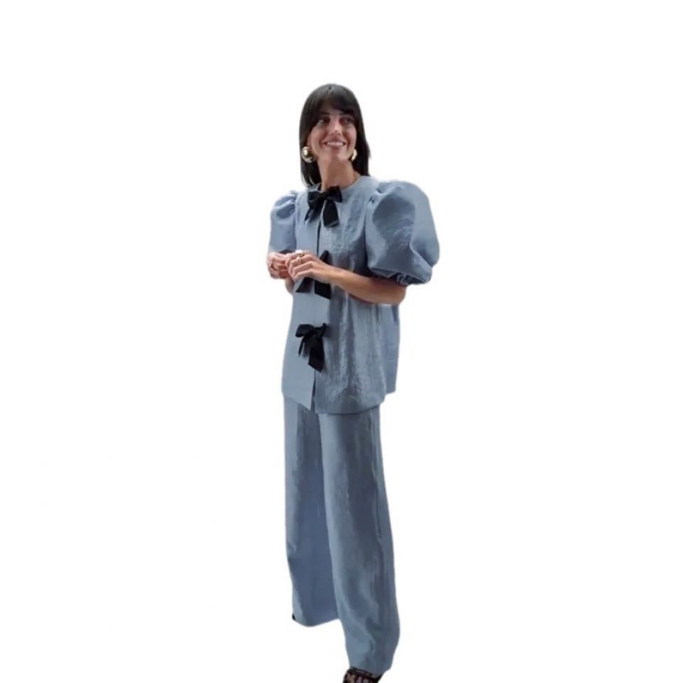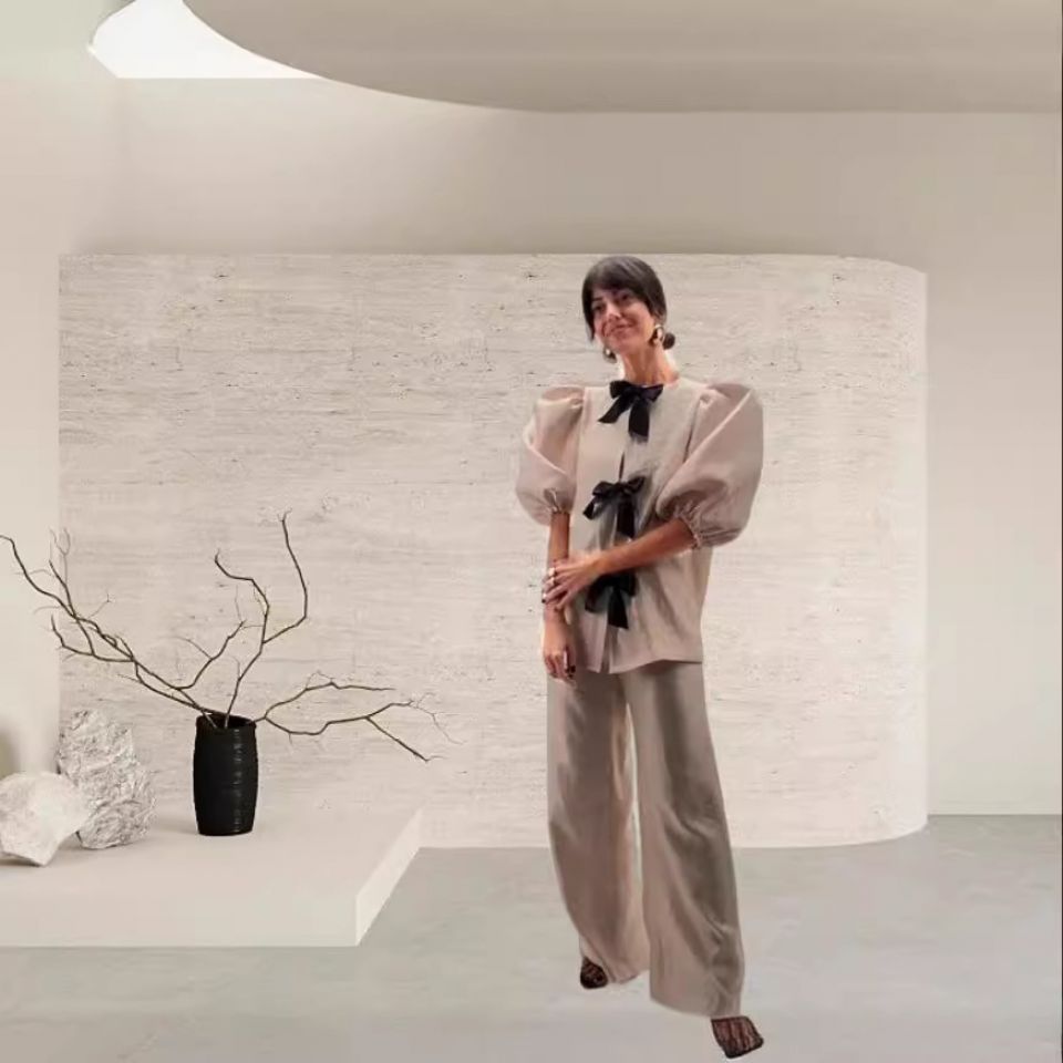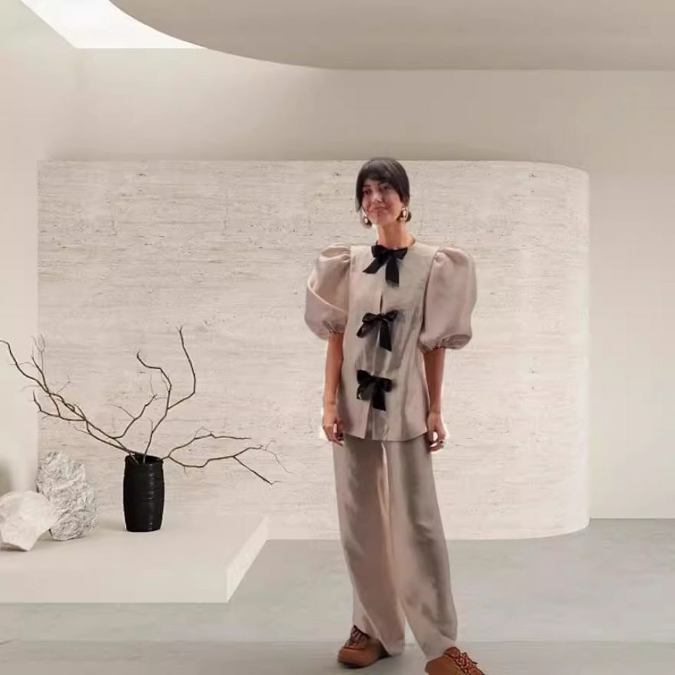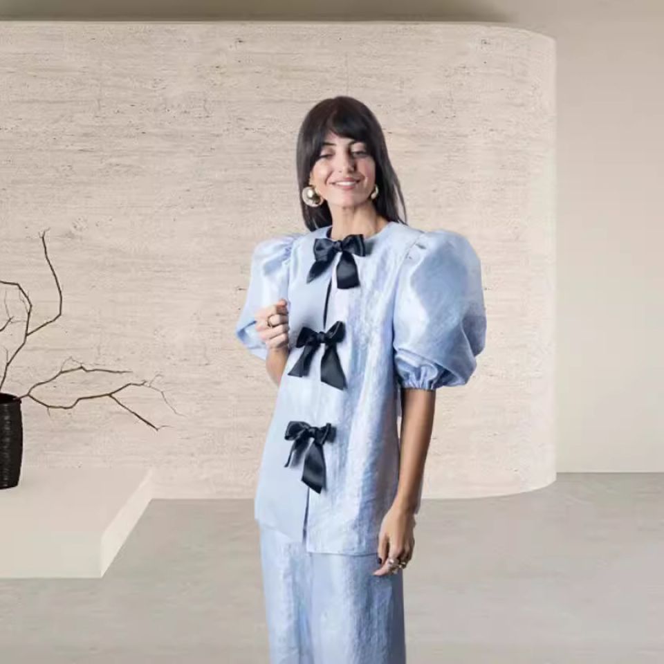 Damen Zweiteiler: Bluse mit Puffärmeln, Schnürdetail und Schleife sowie Hose