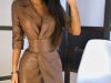 Einfarbiger Anzugkragen aus PU-Leder, mittellanges Damenkleid, Ledermantel mit Gürtel
