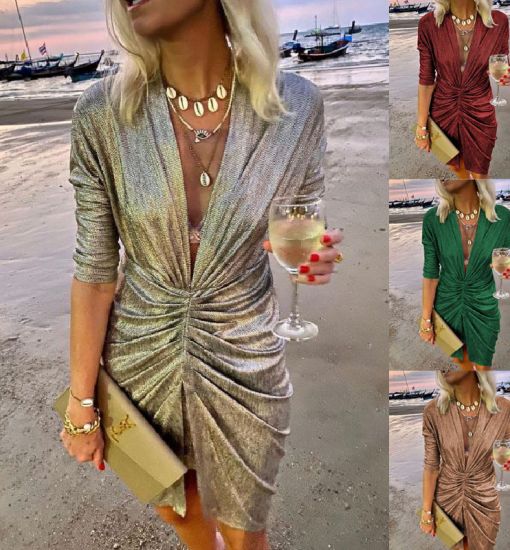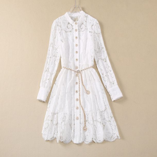 Einreihiges langärmeliges Kleid mit Metallkette und Perlen