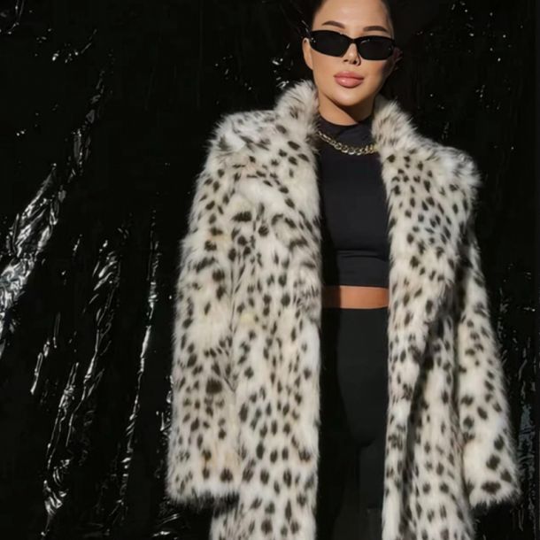 Lang geschnittener Damenmantel mit Leopardenmuster aus Kunstpelz und Fuchspelz mit Kapuze