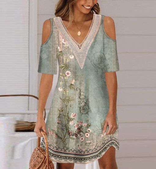 Bedrucktes schulterfreies Kleid mit V-Ausschnitt für Damen