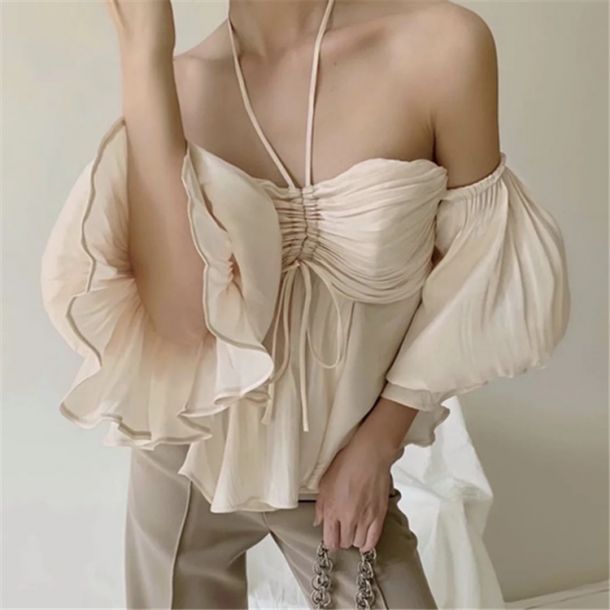 Pure Hot Girl Champagner Aprikosen Perlen Glockenärmel Hemd